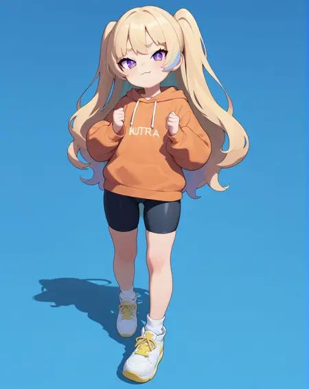 1소녀, 금발 머리, 이색 머리, :3, 피부 송곳니, 보라색 눈, + +,