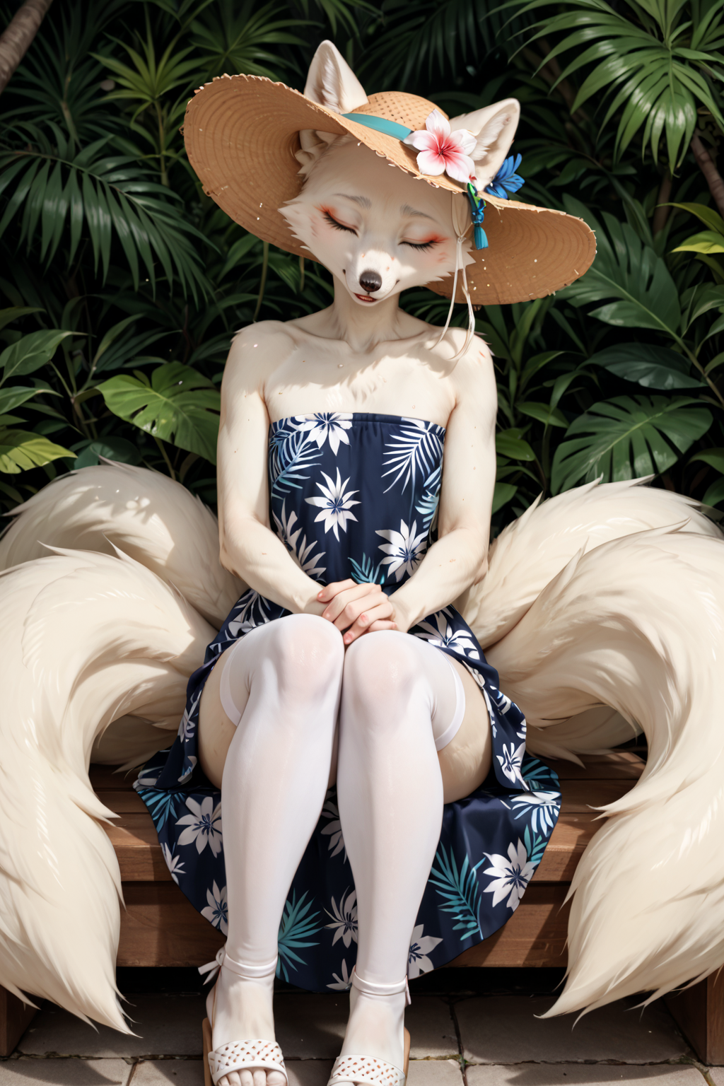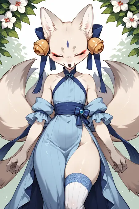 Triggers: Miki, anthro, female, fox, white fur, flat chested, bell, slim, eyes closed, kemono, thick thighs, wide hips, bells, multi tails, thigh highs, leotard