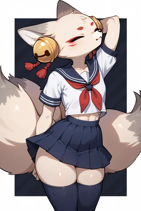 Triggers: Miki, anthro, female, fox, white fur, flat chested, bell, slim, eyes closed, kemono, thick thighs, wide hips, bells, multi tails, thigh highs, leotard