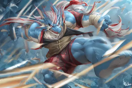 Use "hydoor, dragon, red eyes, blue body, white hair, long hair, fin" and hi-res fix to get better result.