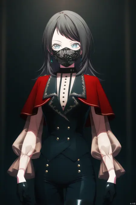 演出服:thigh boots,boots,black gloves,black footwear,see-through,pants,red capelet,thighhighs,black vest,long sleeves,buttons,shirt,black earring,