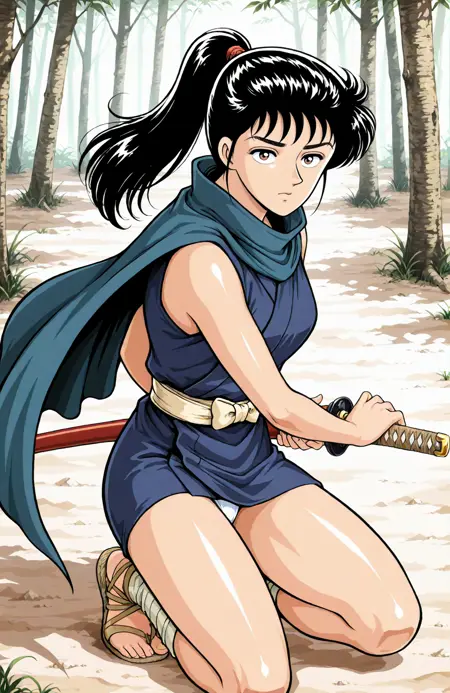 일본 복장, 흰색 오비, 칼, 어깨 없음, 짧은 키모노, 보라색 키모노, 발목 감는 것, 샌들,