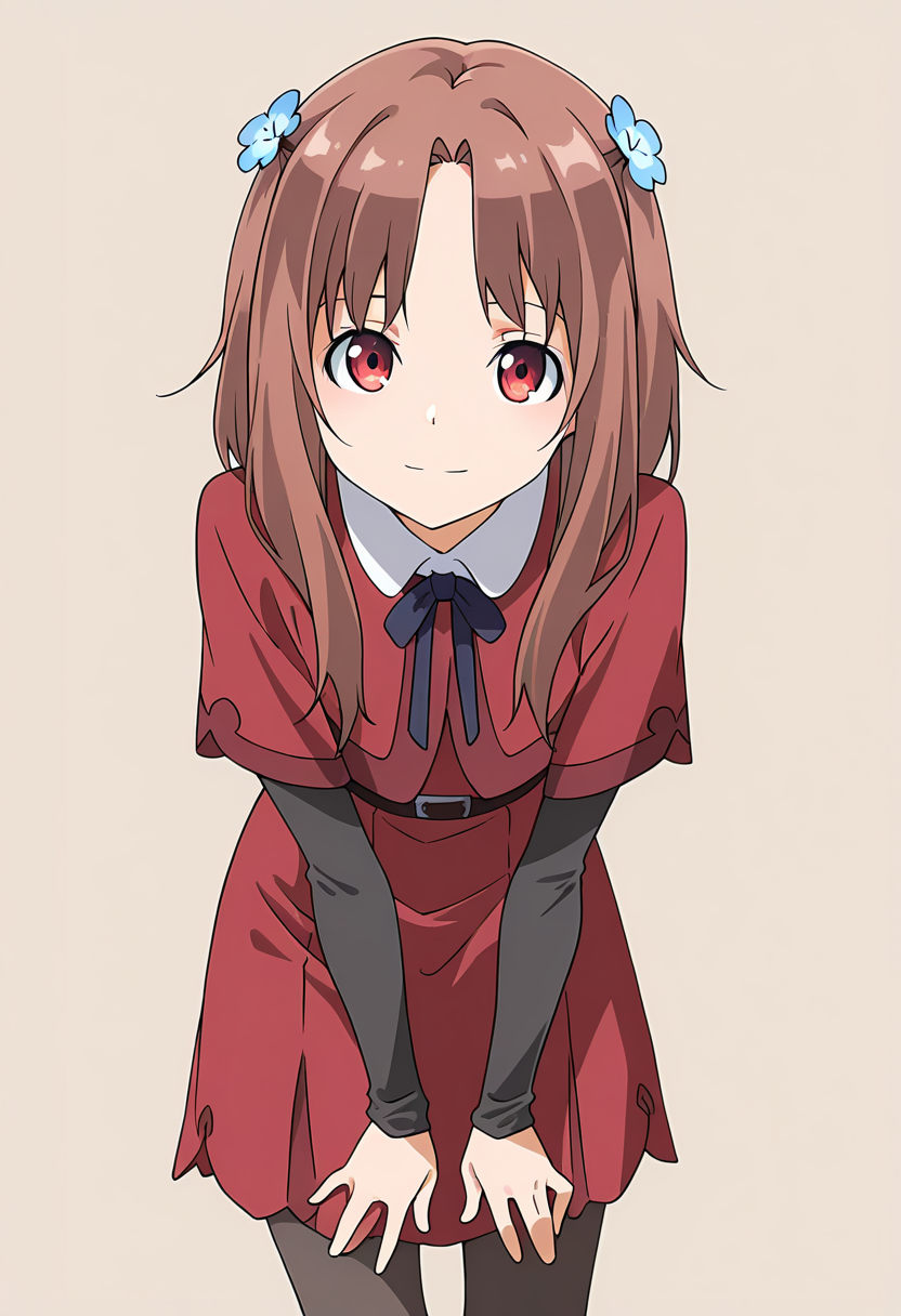 masterpiece,best quality,amazing quality, 1girl, c-hozuki, medium hair, brown hair, red eyes, hair flower, red dress, white collared shirt, brown belt, blue neck ribbon, layered sleeves, short over long sleeves, black pantyhose, leaning forward, looking at viewer, simple background, beige background, light smile,