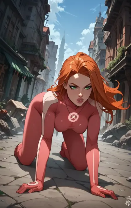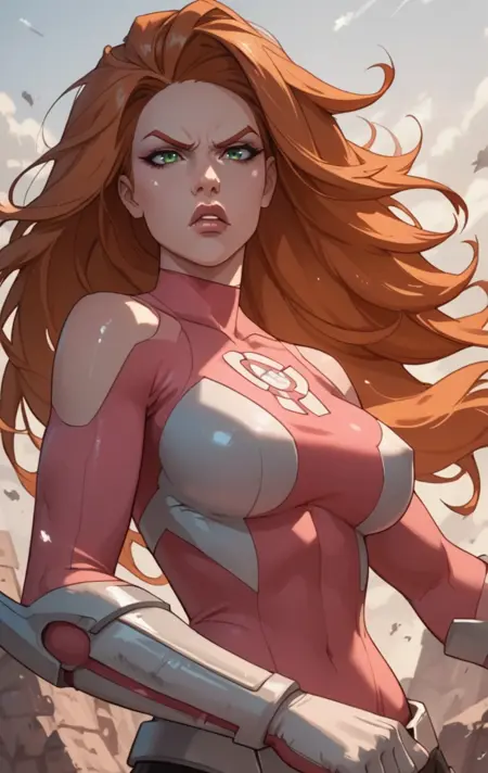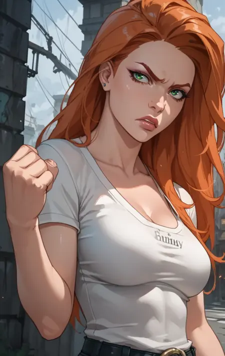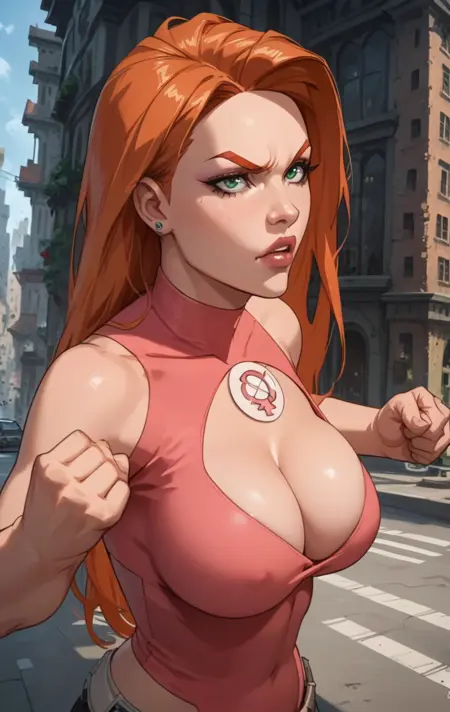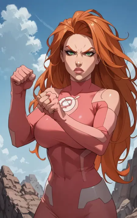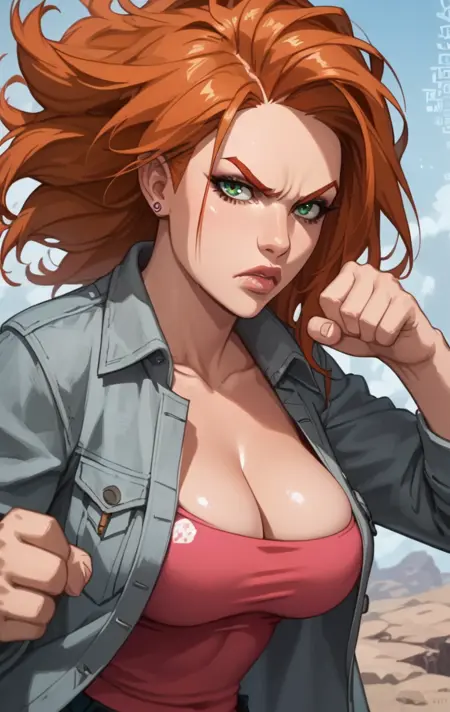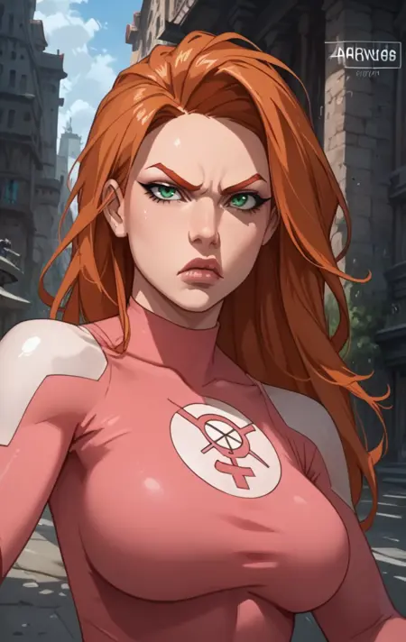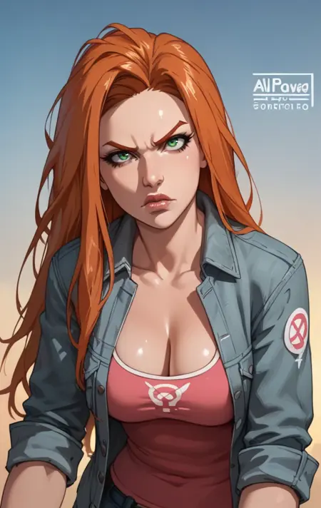 a0t0m3v3, 1girl, solo, long hair, green eyes, orange hair, lips