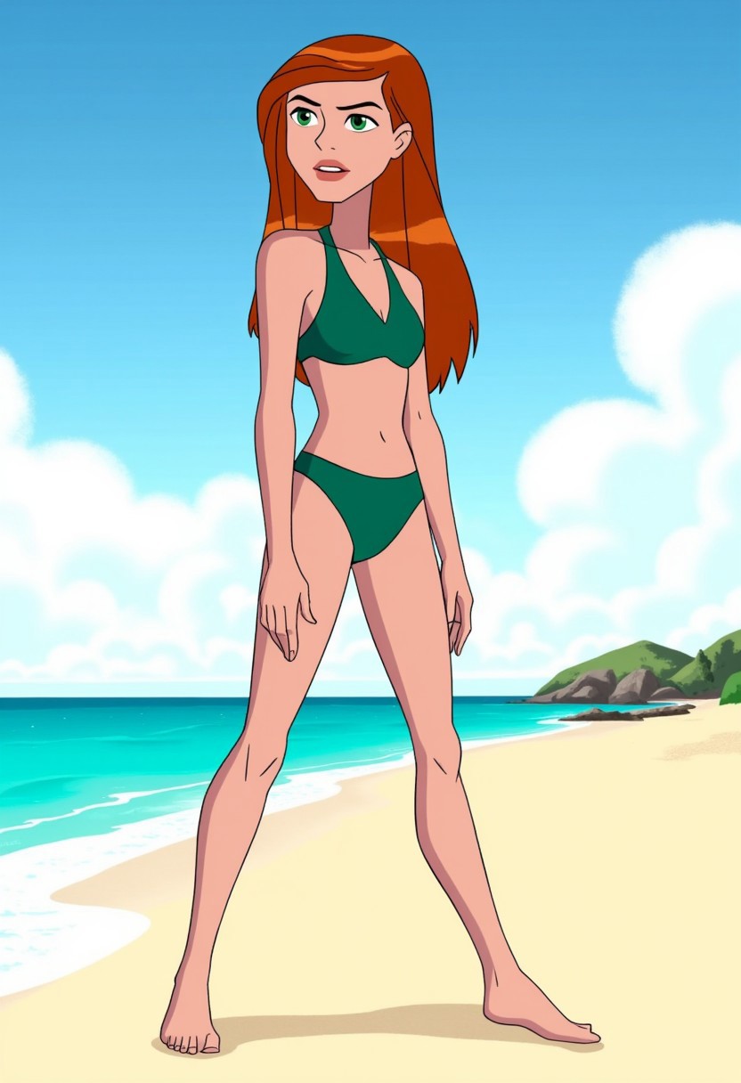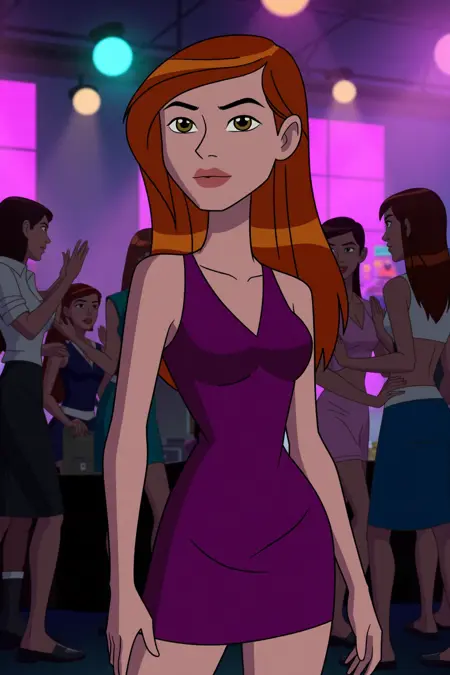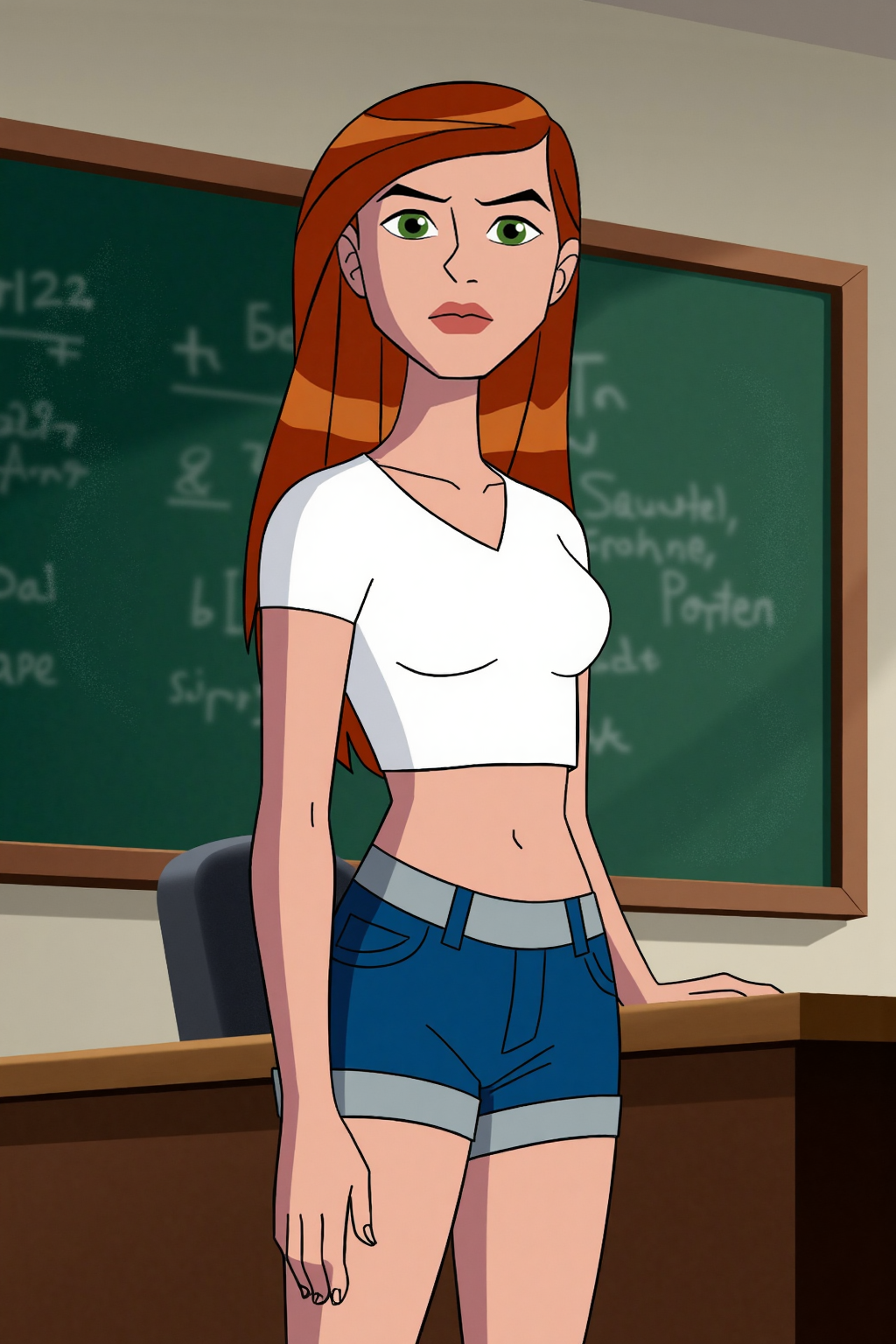 Gwen Tennyson, An animated cartoon image of a woman with long brown hair and green eyes. She is wearing a blue shirt with a white collar and a gray skirt. Her pants are gray and her shoes are black. She has a white belt around her waist.