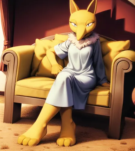 hypno, anthro, yellow body, pointed ears, long nose, white fur, fur collar, slit pupils