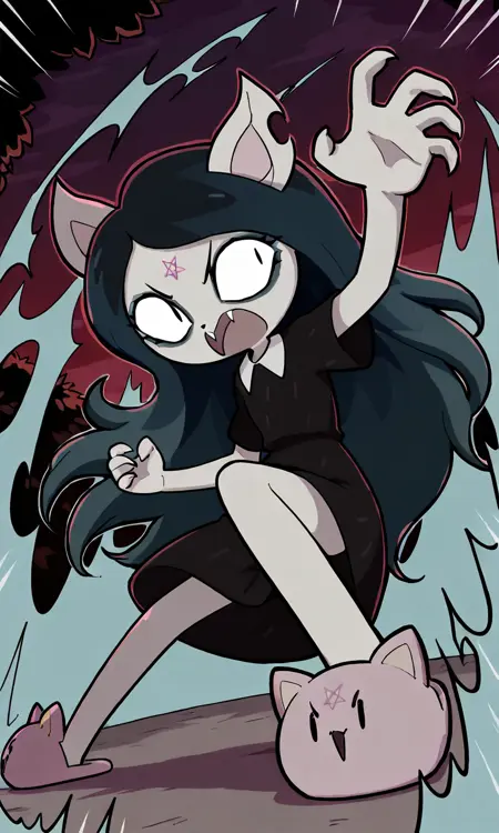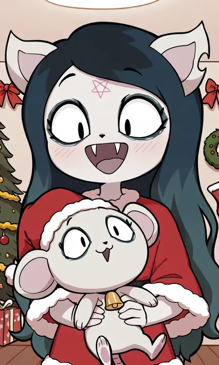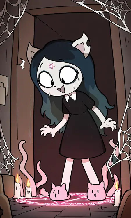 옷: 검은색 칼라 드레스, 분홍색 동물 모양 슬리퍼