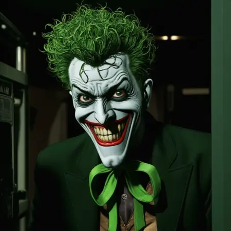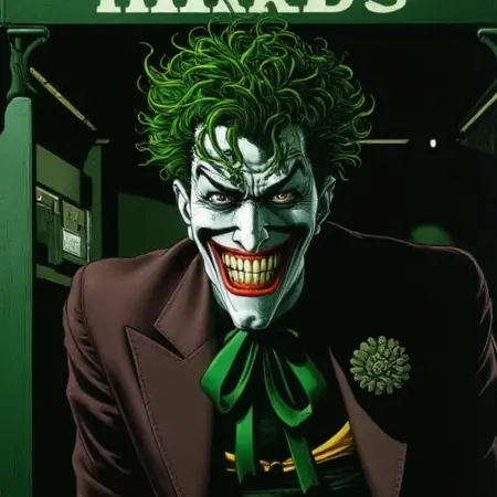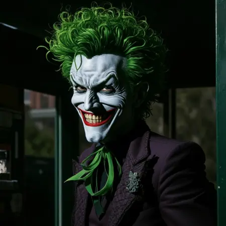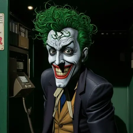 Brian Bolland의 예술 스타일로 그려진 조커, 80년대와 90년대의 “더 킬링 조크”와 수많은 만화표지에 묘사된 모습처럼.