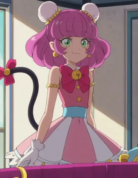 score_9, score_8_up, score_7_up, 애니메이션 스크린캡, 싱글, 1소녀, mao, 흰 장갑, 분홍 드레스, 줄무늬 치마, 보석, 귀걸이, 리본, 소매 없음, 머리띠, 검은 고양이 꼬리, 꼬리 장식,lora:mao:0.8
