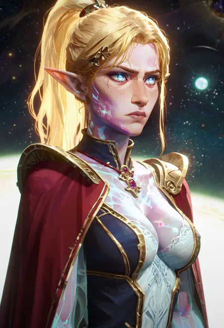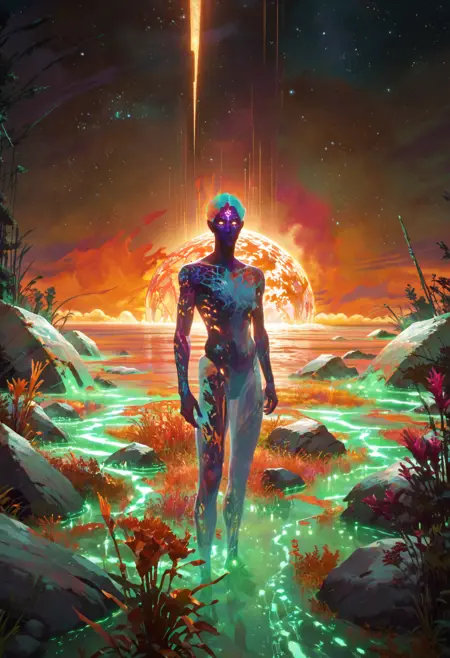 アストラルな平面やビクターがいた世界のような光るスタイルを再現したい場合は、以下の追加プロンプトをご使用ください:surreal, abstract, glowing, neon, glowing eyes, space, astral, stars, colored skin, see-through body, glowing hair, glowing skin,