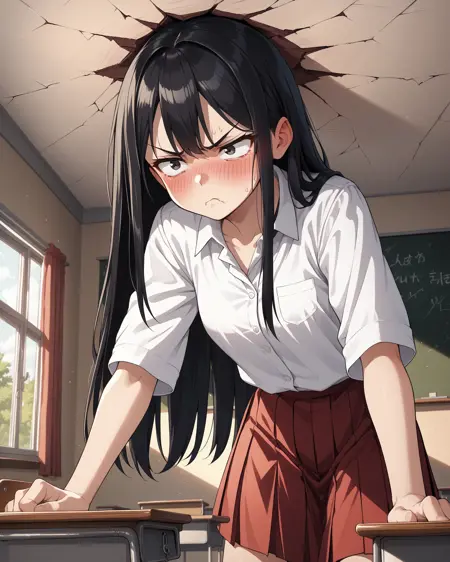 Produces an image of a giantess character in a room or environment that they are too big for. The main triggerword is gtscramped.
