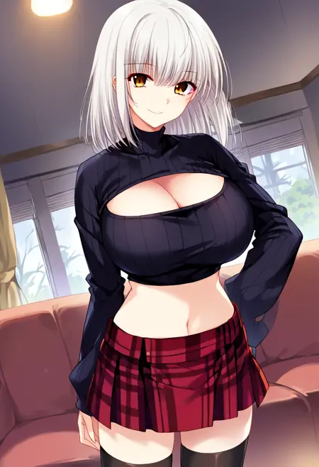 otonashi_madoka,1girl,solo,huge breasts,collarbone,cleavage,white hair,medium hair,yellow eyes,open-chest sweater,long sleeves,black sweater,clothing cutout,ribbed sweater,turtleneck sweater,black thighhighs,red skirt,plaid skirt,plaid,midriff,zettai ryouiki,navel,