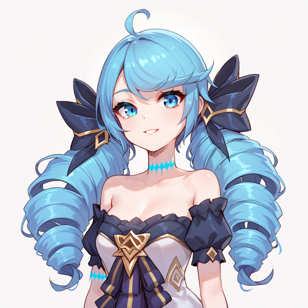 gwenlol, blue hair, blue eyes, twin drills, ahoge