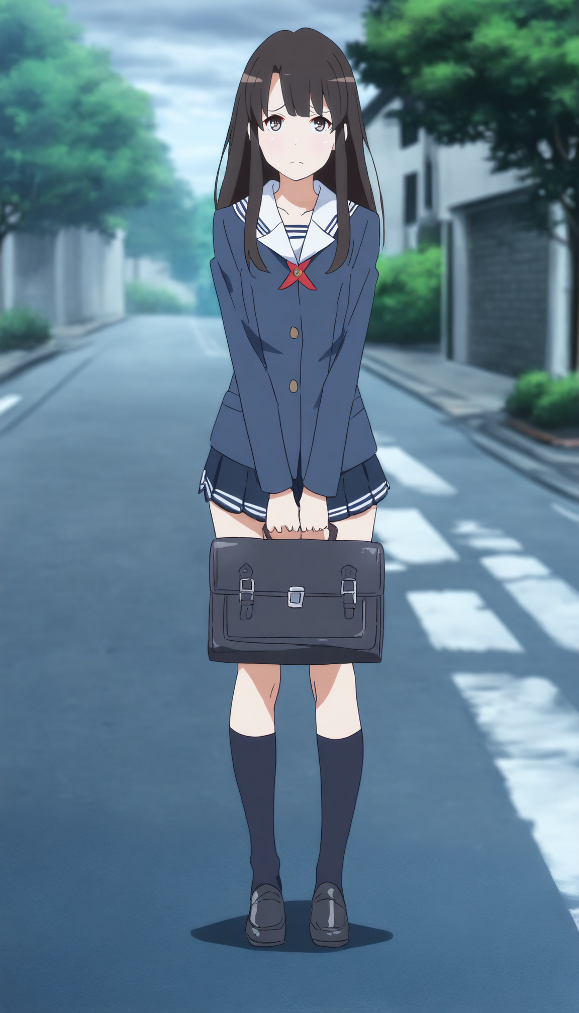 m3gum1kat0, 1girl, solo, black hair, long hair, bangs, brown eyes, a blue track suit draped over shoulder, white long sleeves school shirt, red tie, blue pleated skirt, blue kneehighs,