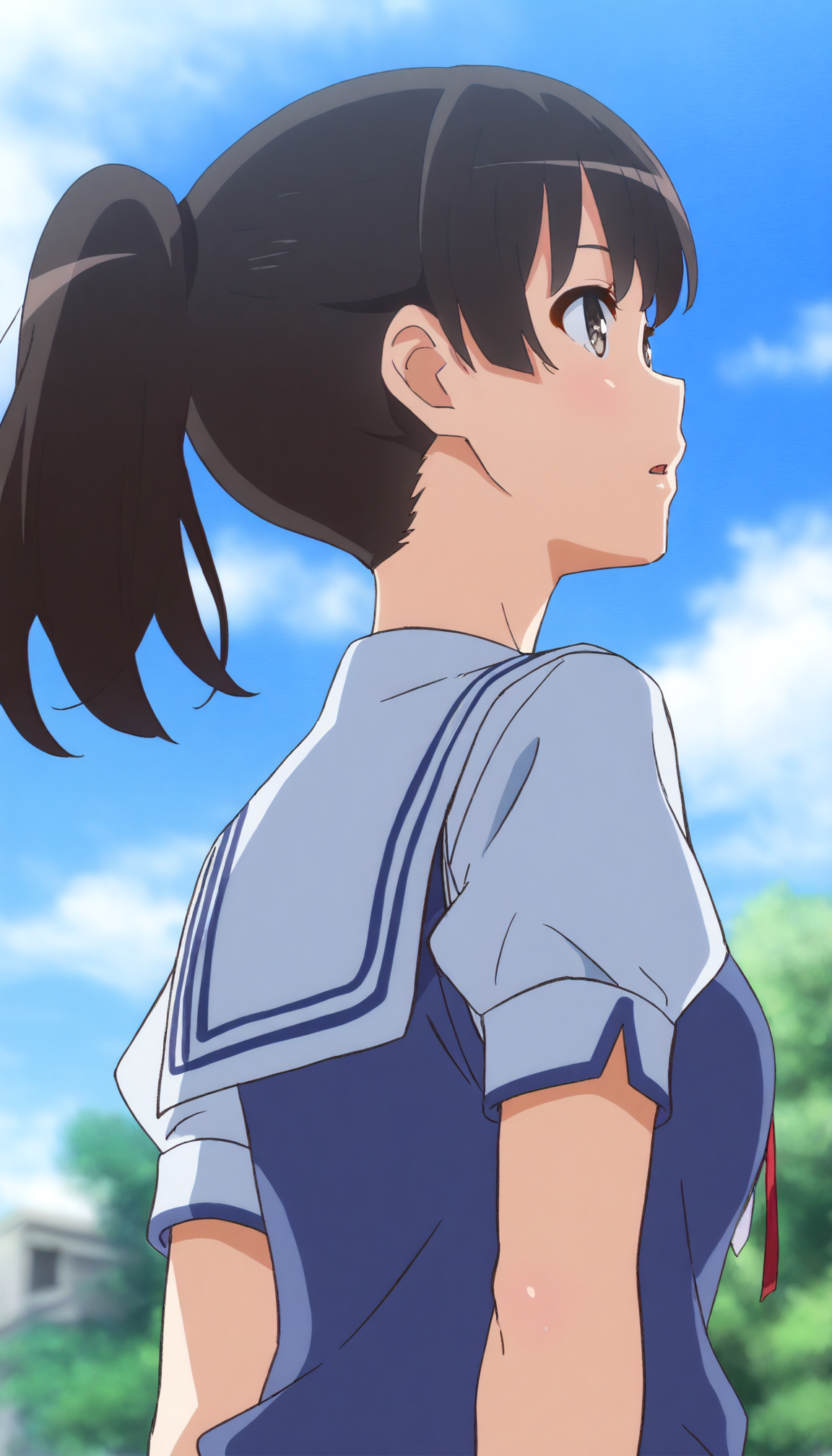 m3gum1kat0, 1girl, solo, black hair, bangs, ponytail, brown eyes, pupils, gym uniform,