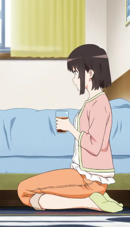 m3gum1kat0, 1girl, solo, black hair, short hair, bangs, brown eyes, pupils, pink cardigan with yellow trim, white loose blouse, rolled up pink capri pants, white sneakers,
