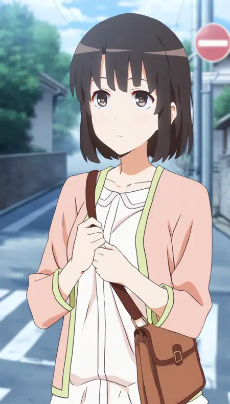 m3gum1kat0, 1girl, solo, black hair, bangs, ponytail, brown eyes, pupils, white collar dress, blue trim cardigan, brown boots,