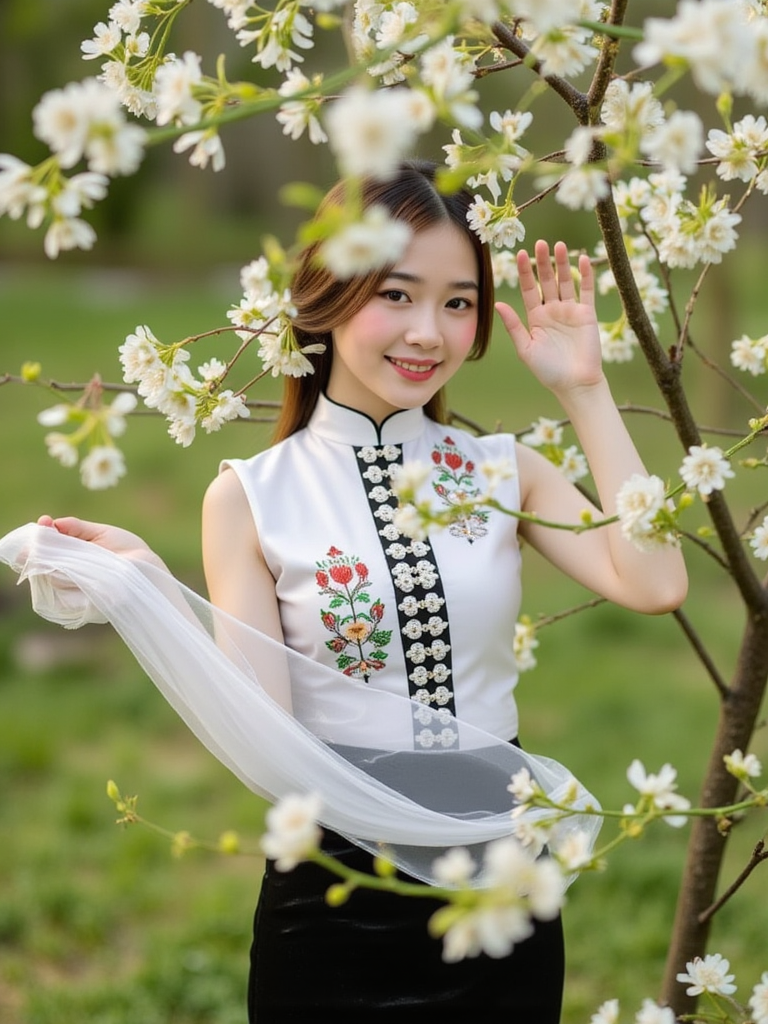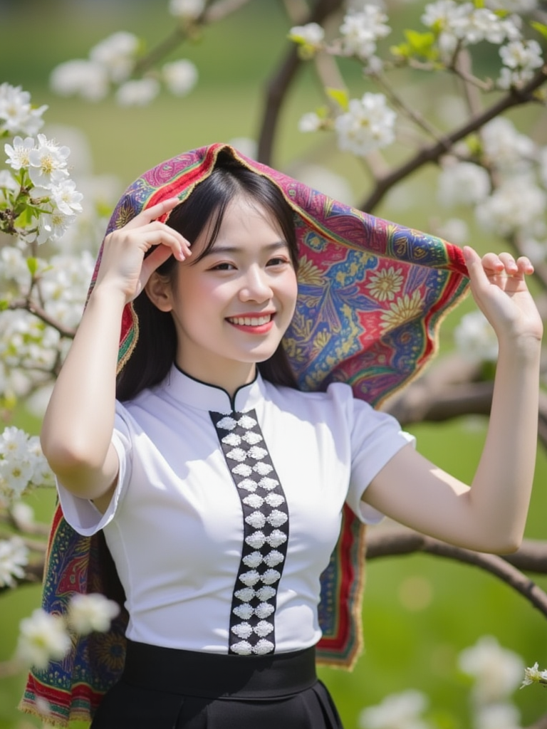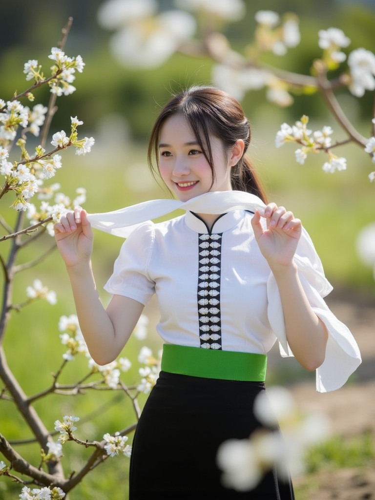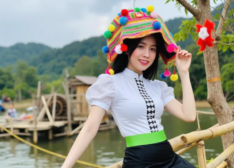ctai, dantocthaitrang、静かな川の近くで、木製の水車と緑豊かな丘を背景に、伝統的なベトナム・タイ族の衣装をまとった若い女性がポージングしている。彼女は、房とポンポンで飾られた鮮やかで複雑な模様の頭飾り、白い刺繍入りのブラウス、緑色のゴムウェストの黒いスカートを着ている。竹製の構造物や周囲の木に飾られた赤い装飾を含む、自然の美しさに満ちた鮮やかな背景が、このシーンに活気と文化を感じさせる。