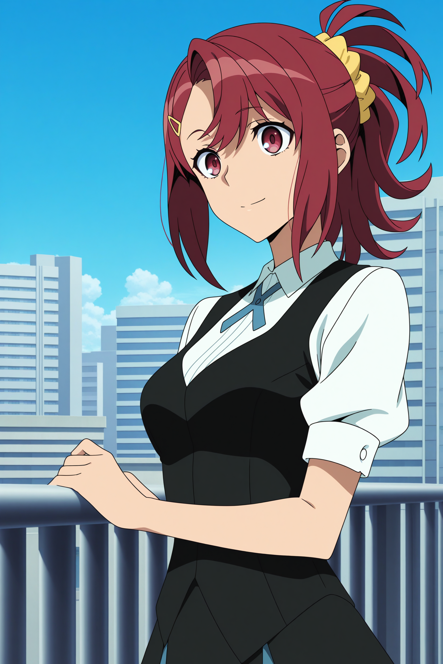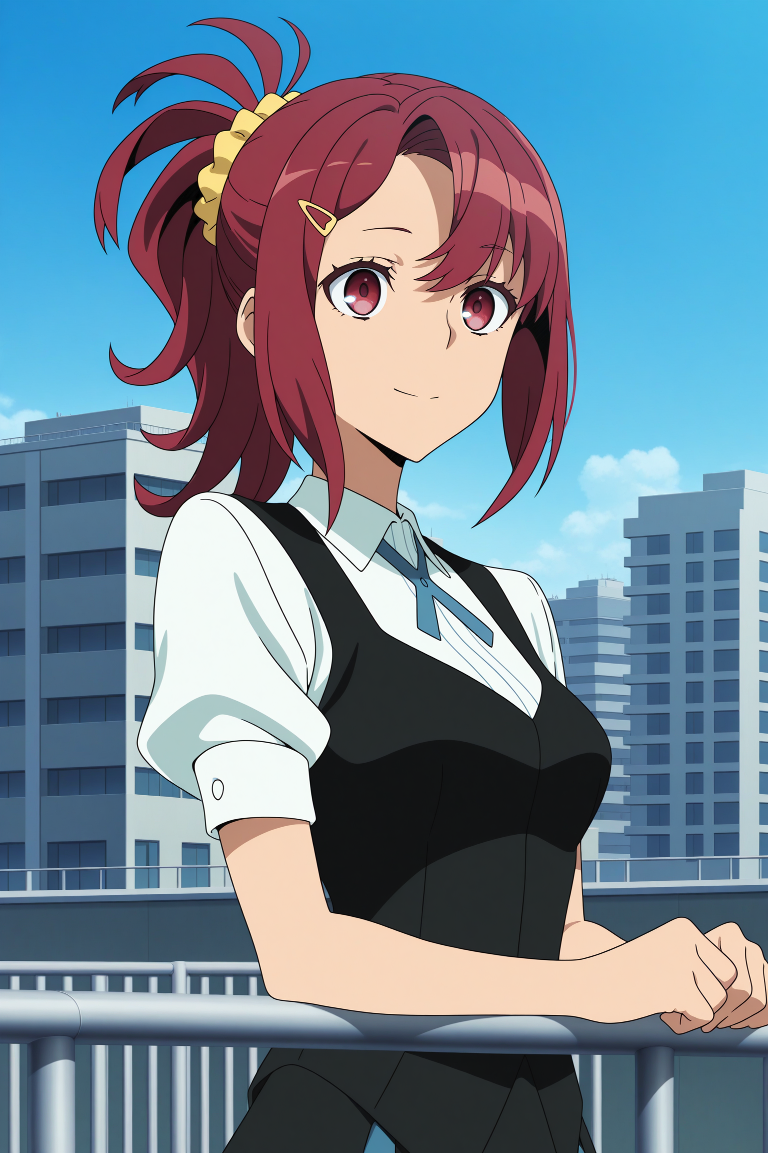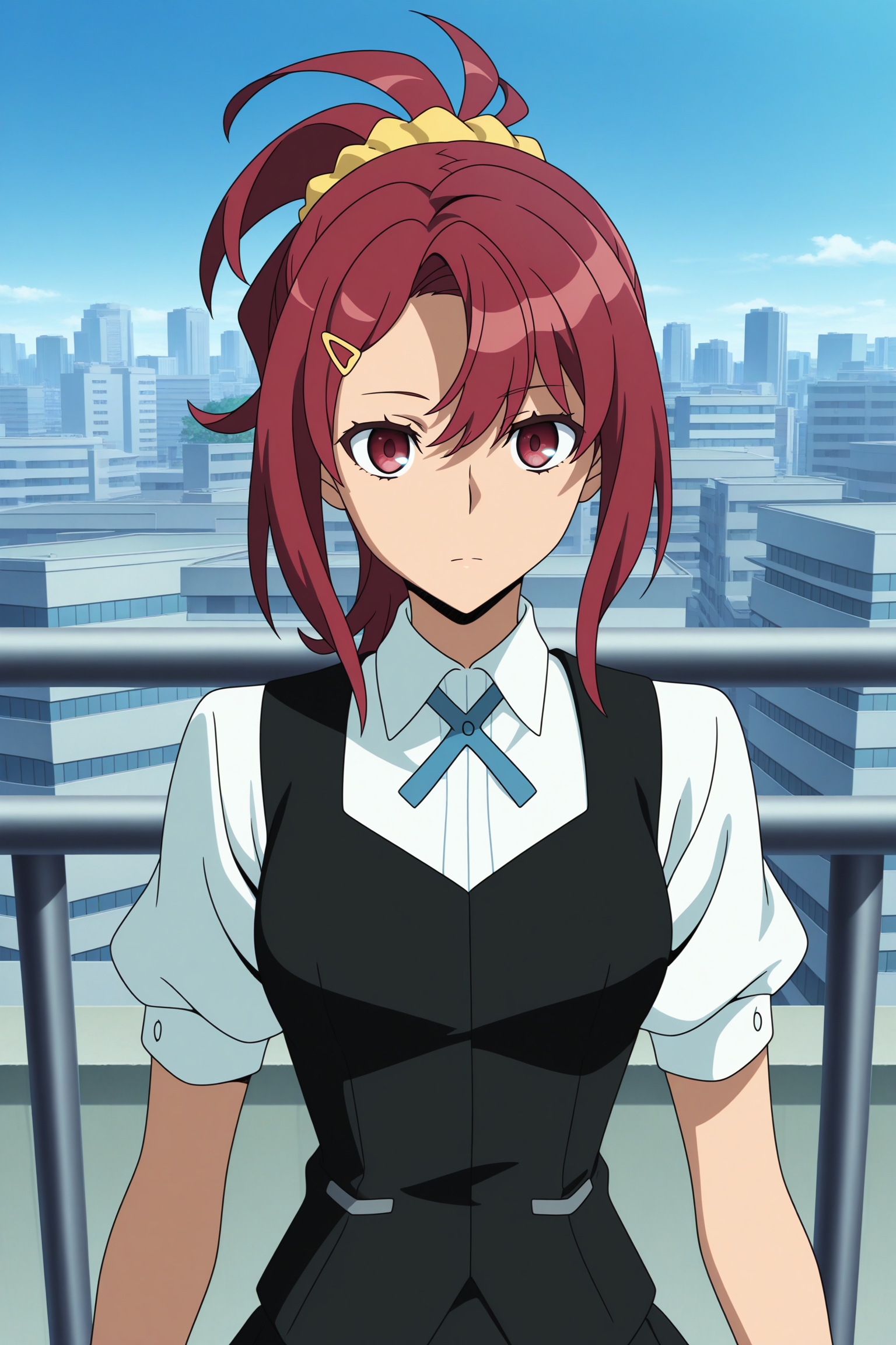 takashiro chidori, medium hair, red hair, high ponytail, yellow scrunchie, yellow hairclip, red eyes, school uniform, short sleeves, white shirt, collared shirt, black vest, blue neck ribbon, black skirt, pleated skirt, black kneehighs, grey-white sneakers