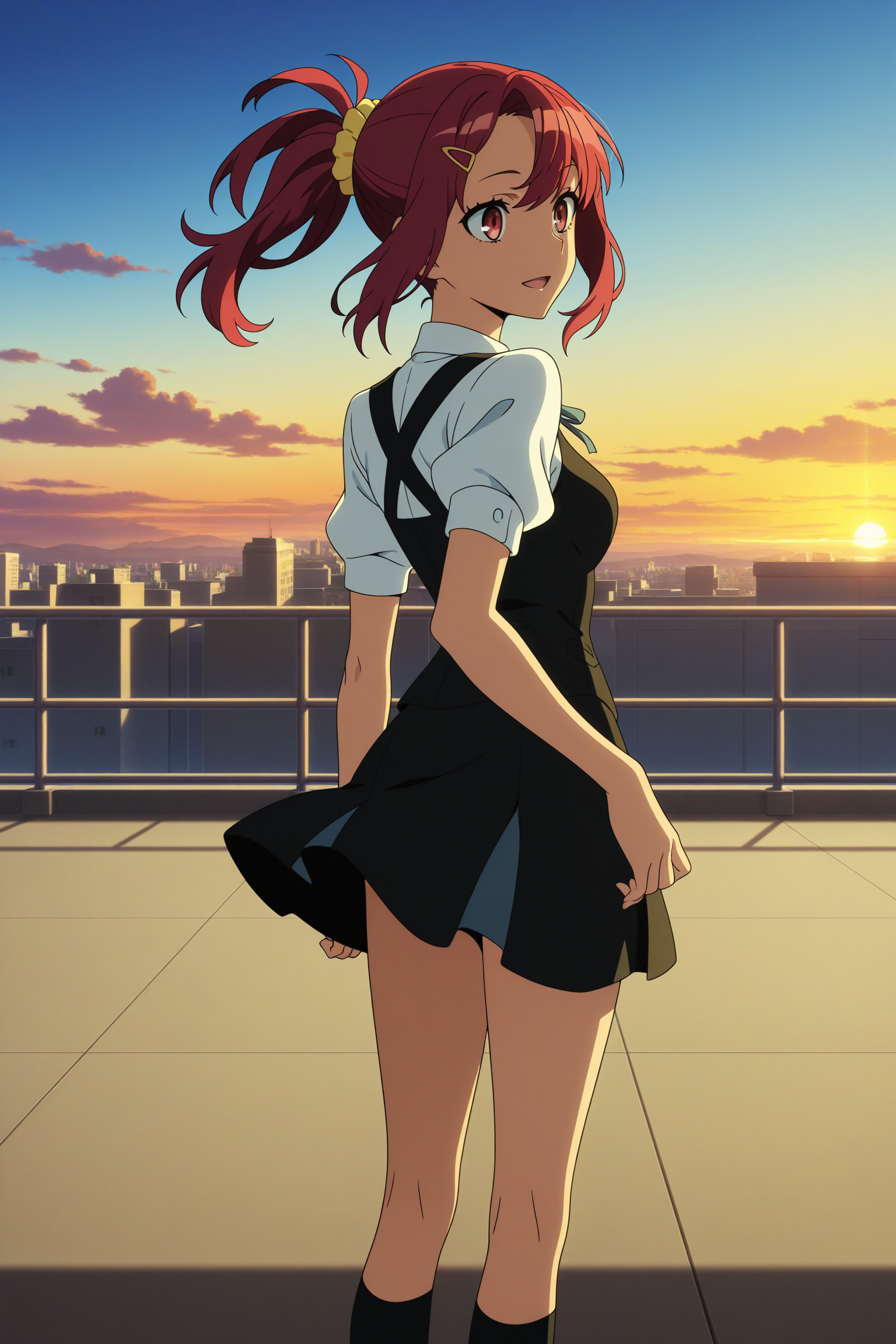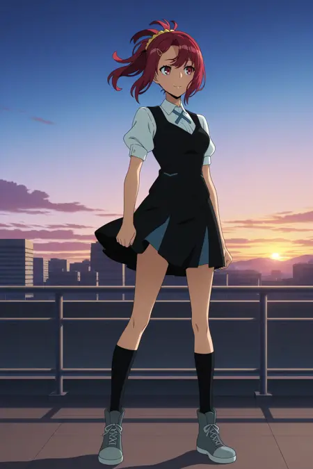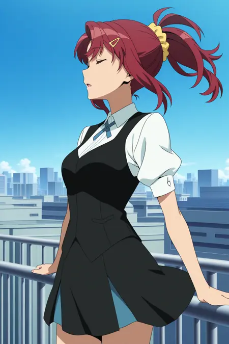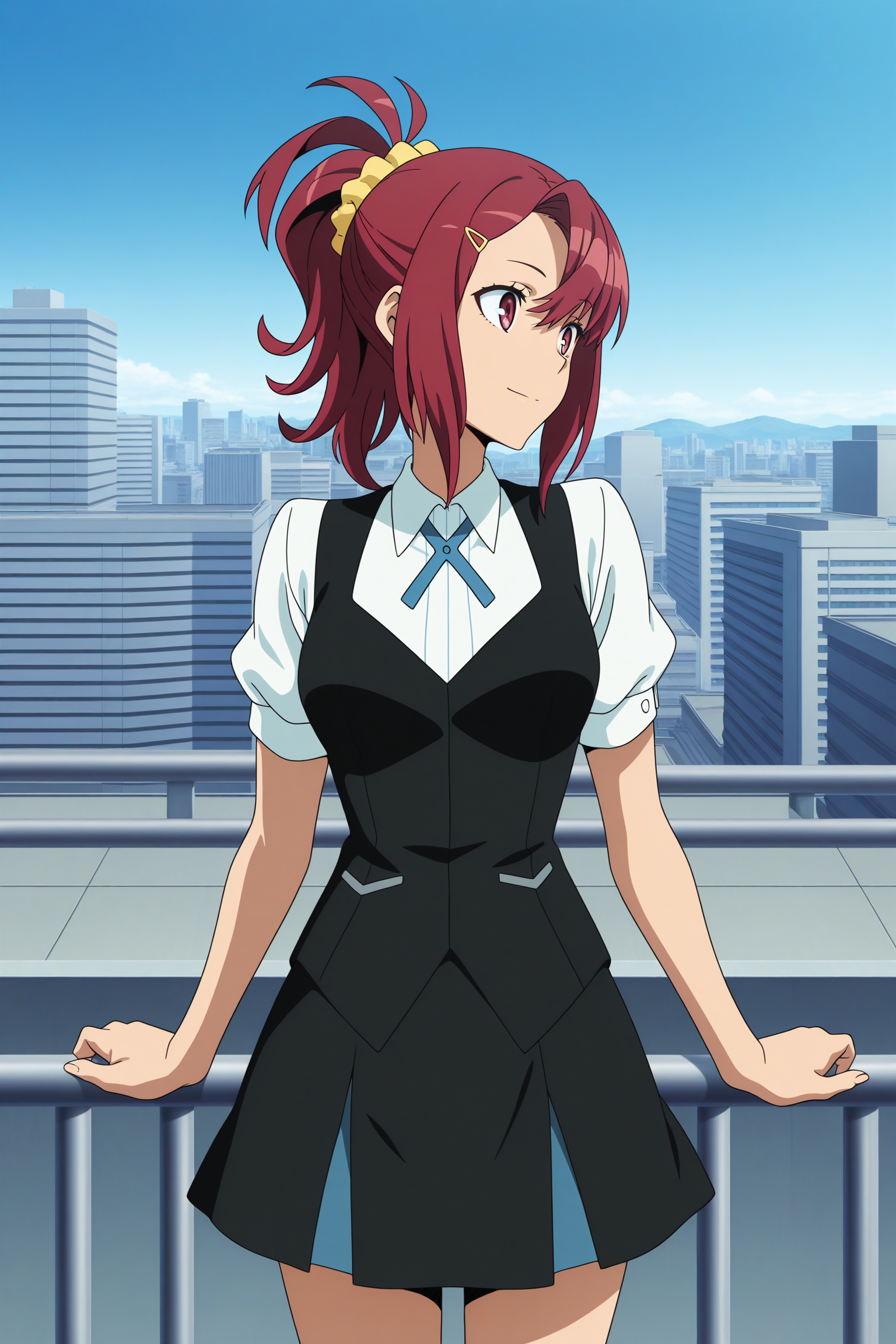 takashiro chidori, medium hair, red hair, high ponytail, yellow scrunchie, yellow hairclip, red eyes, school uniform, short sleeves, white shirt, collared shirt, black vest, blue neck ribbon, black skirt, pleated skirt, black kneehighs, grey-white sneakers