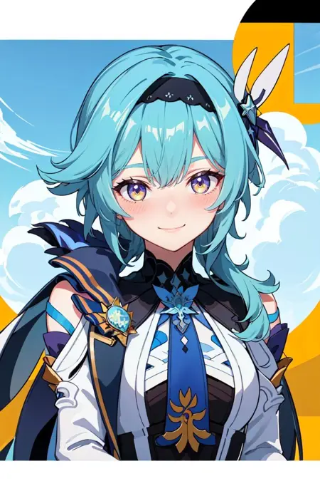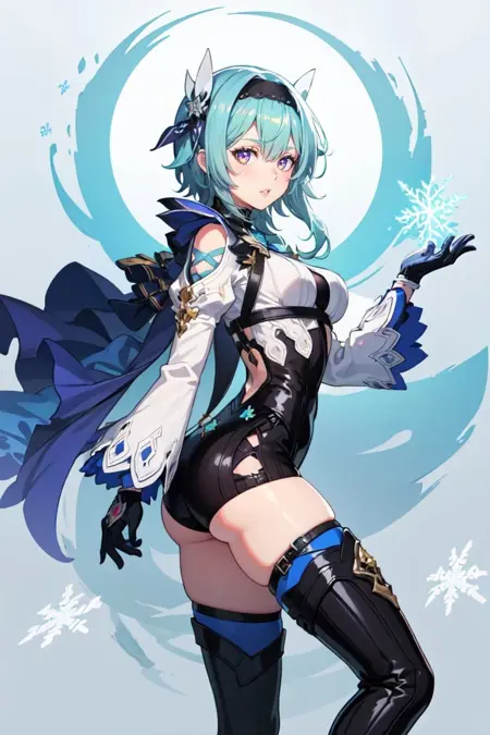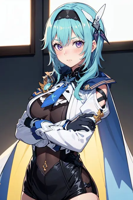 基础起始标签:pikkyeula, 1girl, solo, looking at viewer, blue hair, bangs, medium hair, yellow eyes, purple eyes, breasts, large breasts, hairband, hair ornament, black hairband, gloves, necktie, leotard, cape, thighhighs, long sleeves, blue necktie, black gloves, black leotard, thighs, vision (genshin impact)