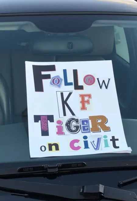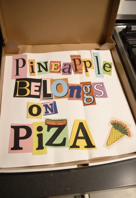 - (SUBJECT)가 다른 손에 다양한 질감과 패턴의 색종이 조각으로 장난스럽고 자른 듯한 스타일로 쓰인 "(TEXT)"라는 텍스트가 적힌 종이를 들고 있는 사진