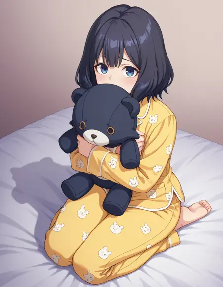 tino shade, medium hair, black hair, red hair bow, dark blue eyes