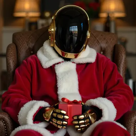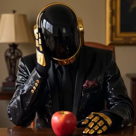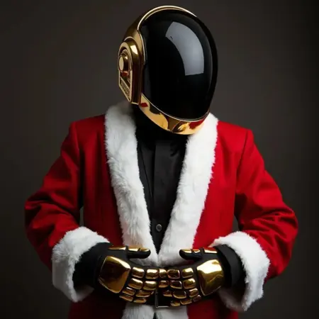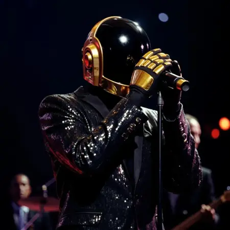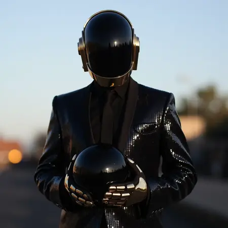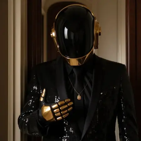 gmhc, a man with a glossy gold-black helmet, black gloves, black sequined suit, and robotic hands with gold backs, black fronts, and golden fingertips.