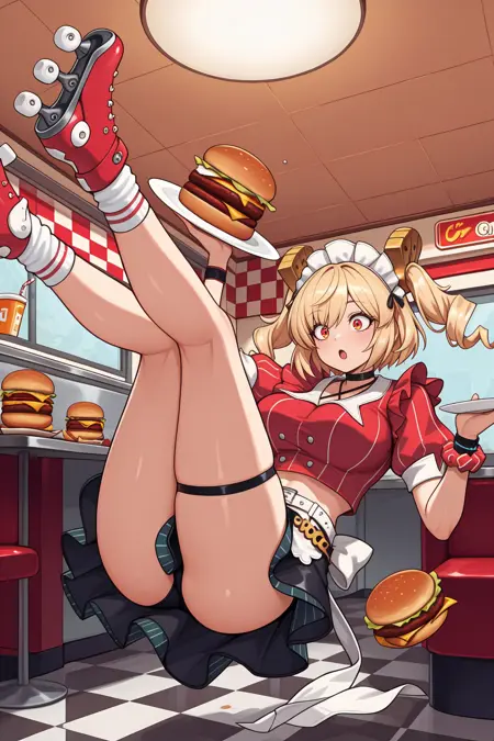 Operation Yum 2025:ドリルヘア、メイドヘアドレス、黒いチョーカー、クロスハーネック、襟付きシャツ、赤いシャツ、縦縞シャツ、短めのシャツ、フリル付きシャツ、ふくらはぎ袖、ボタン、腹出し、複数のベルト、白いベルト、ウエストエプロン、白いエプロン、黒いプリーツスカート、レイヤードスカート、ミニスカート、太ももベルト、足首バンド、白い靴下、赤い靴、ローラースケート、黒いリストバンド、赤い wrist scrunchie