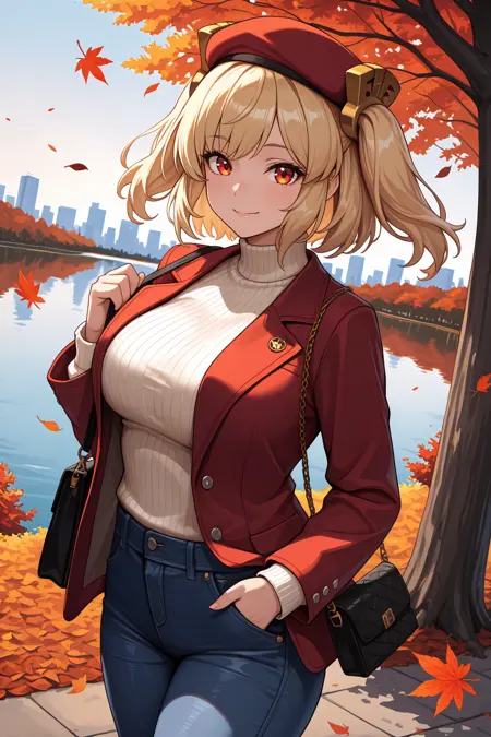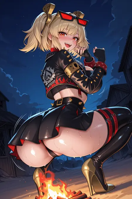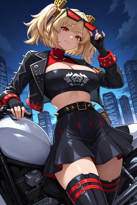 デフォルトの服:頭に眼鏡、赤みがかった眼鏡、黒いジャケット、スパイク付きジャケット、レザージャケット、短めのジャケット、開いたジャケット、腕輪、赤いタートルネック、ハーネック、ツートンチューブトップ、黒いチューブトップ、白いチューブトップ、胸元の強調、黒いベルト、スパイク付きベルト、ハイウェストスカート、黒いミニスカート、プリーツスカート、赤い太ももベルト、黒い太ももブーツ、ハイヒールブーツ、肘までグローブ、フィンガーレスグローブ、黒いグローブ
