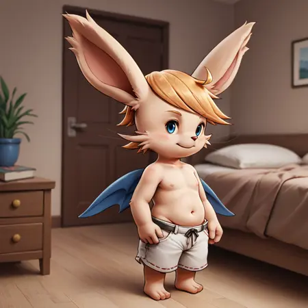 ffhurdy, moogle, furry, plump:0.5, gnome, cute, male focus, 1boy, blonde hair, rabbit ears, blue_wings, solo,