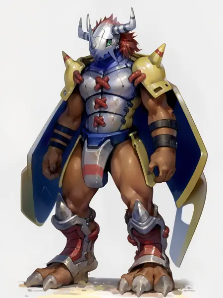 Wargreymon 结构过于复杂,部件太多,几乎不可能在不使用内补或 ControlNet 的情况下生成完美的装甲图像。裸体图像效果更好。