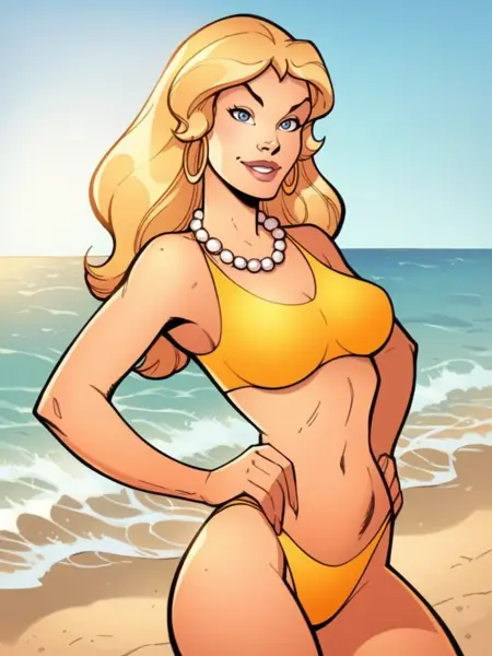 服装:"blue eyes, long hair, blonde hair, pearl necklace, hoop earrings, belt, tank top, yellow pants"