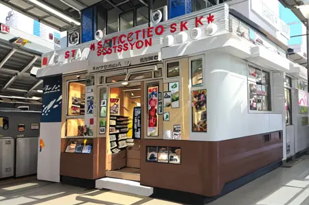STOKYO, STSDS, shop, convenience store, train station, scenery, multiple boys, real world location, bag, storefront, backpack, 1boy, outdoors, city, sign, building,