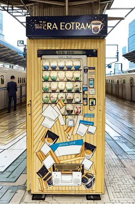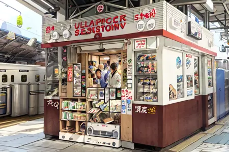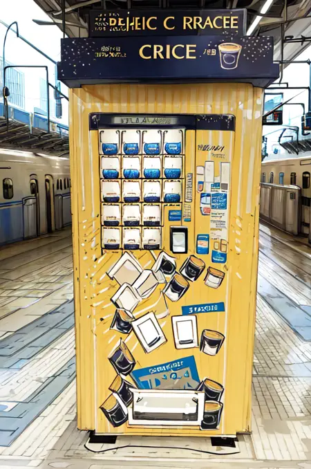 世界中の誰も期待していなかった、誰も欲しがっていなかった、誰得素材東京駅シリーズ第5弾。東京駅の東海道新幹線ホームにある売店「デリカステーション」とスジャータの「シンカンセンスゴイカタイアイス」アイスクリーム自販機の風景を描ける(かもしれない)LoRAです。