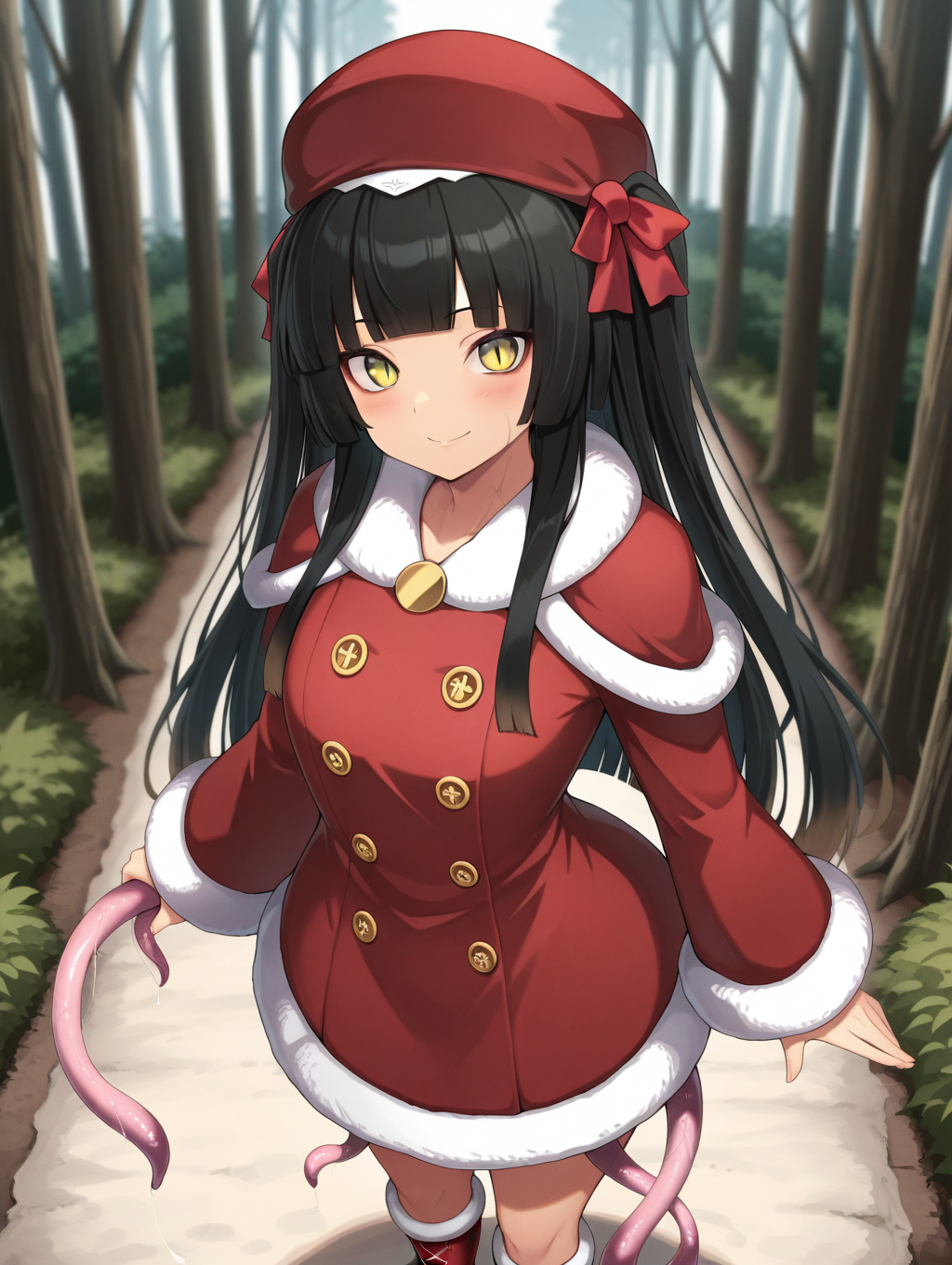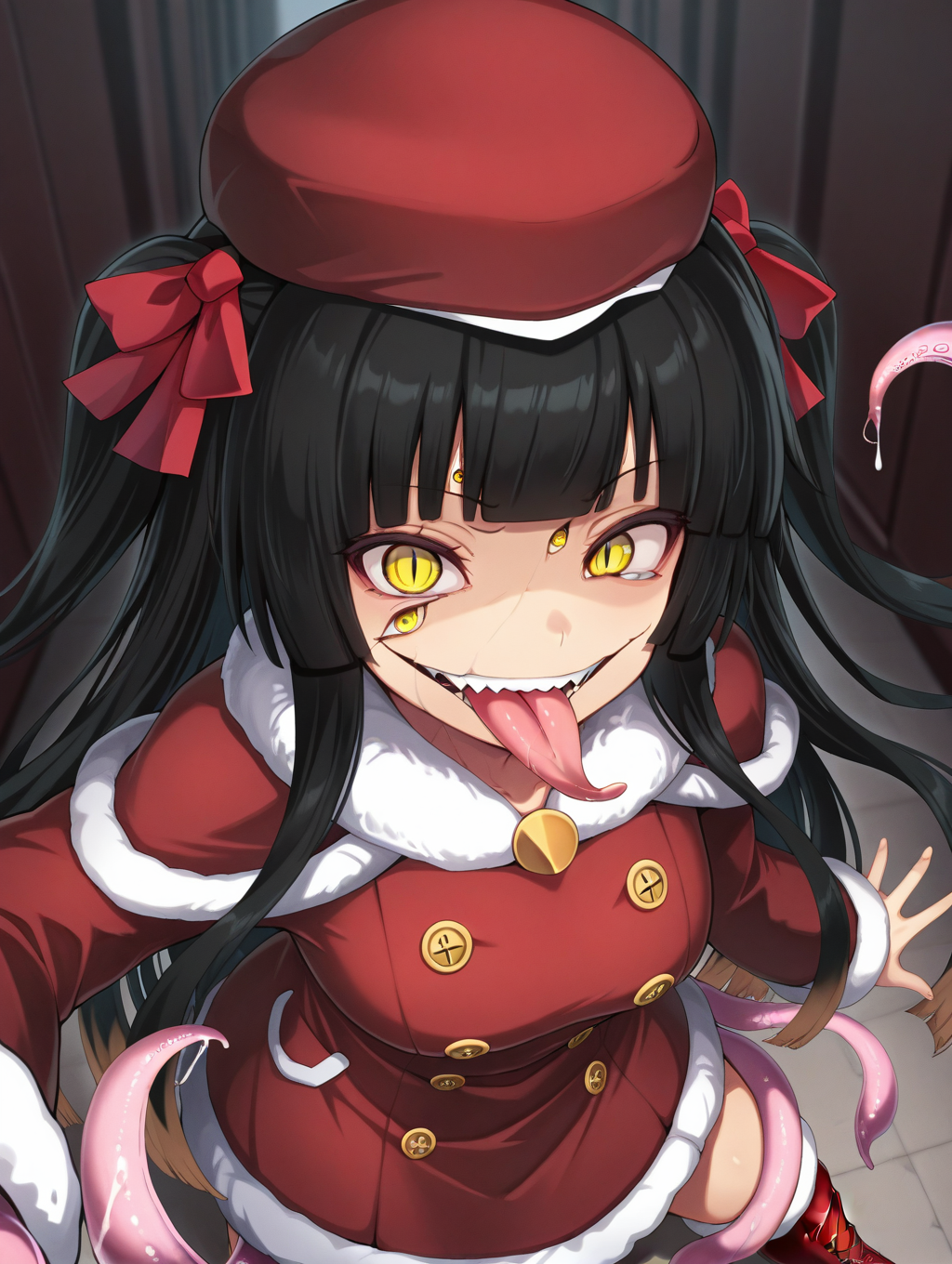 히루코, 긴 머리, 검은 머리, 노란 눈, 곧은 앞머리, 수직 동공, 붉은 모자, 베레모, 리본, 빨간 코트, 모피 장식, 빨간 부츠, 드레스 아래의 촉수,