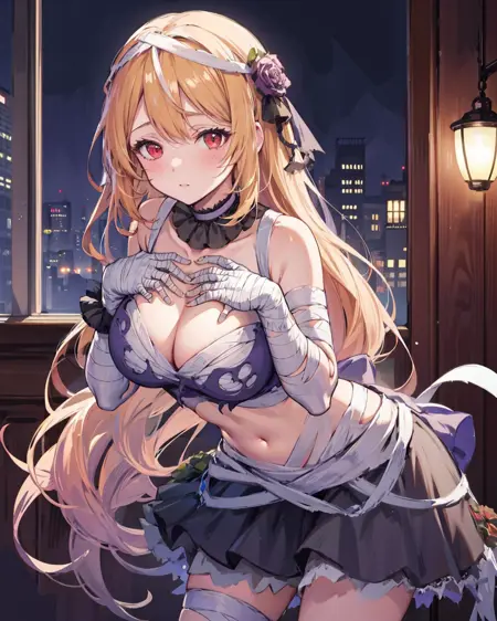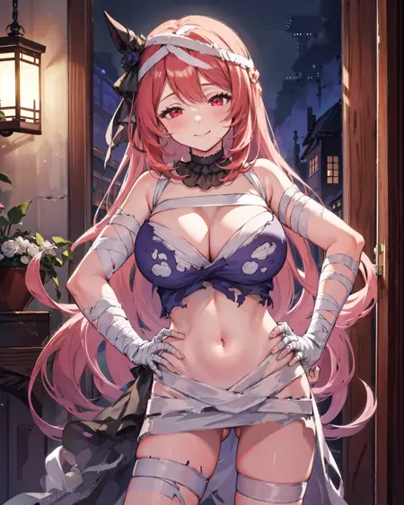 전체 복장: 미라 의상, 붕대, 붕대 감긴 머리, 머리 장식, 프릴이 있는 목걸이, 프릴이 있는 스커트