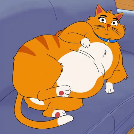 Cat, tabby cat, chubby, fat, orange fur, white belly, white paws, dipstick, red nose, blue collar,