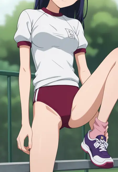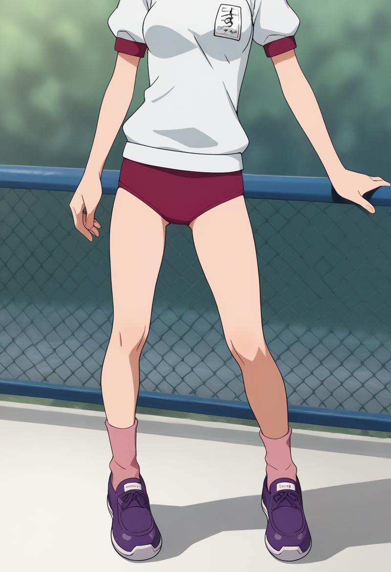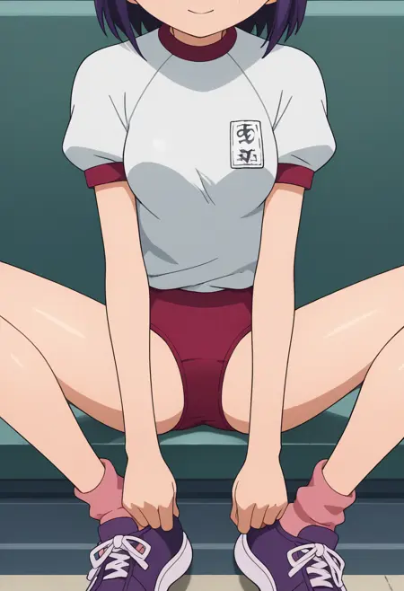 score_9, score_8_up, score_7_up, score_6_up, score_5_up, score_4_up, masterpiece, source_anime BREAK 1girl, ct-gy, 중간 크기 가슴, 체육복, 짧은 소매, 분홍색 부루마, 보라색 신발, 분홍색 양말,