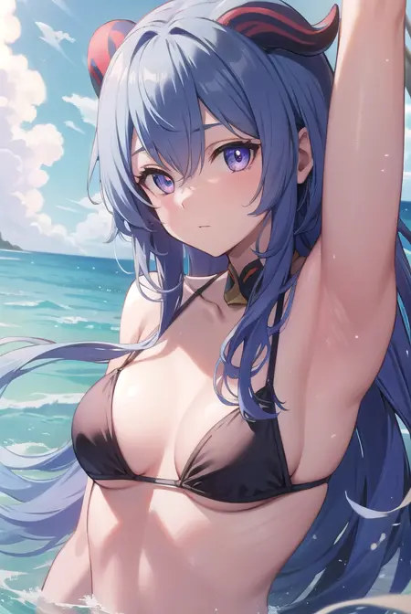 ganyu, 파란 머리, 염소 뿔, 뿔, 긴 머리, (보라색 눈:1.1), 옆머리,
