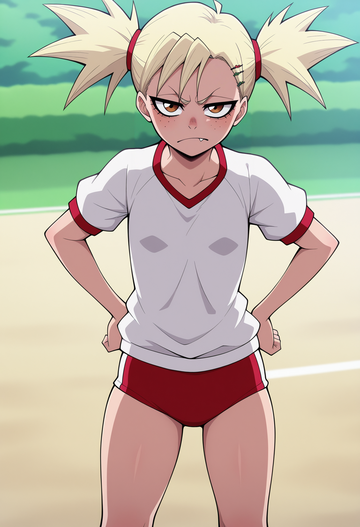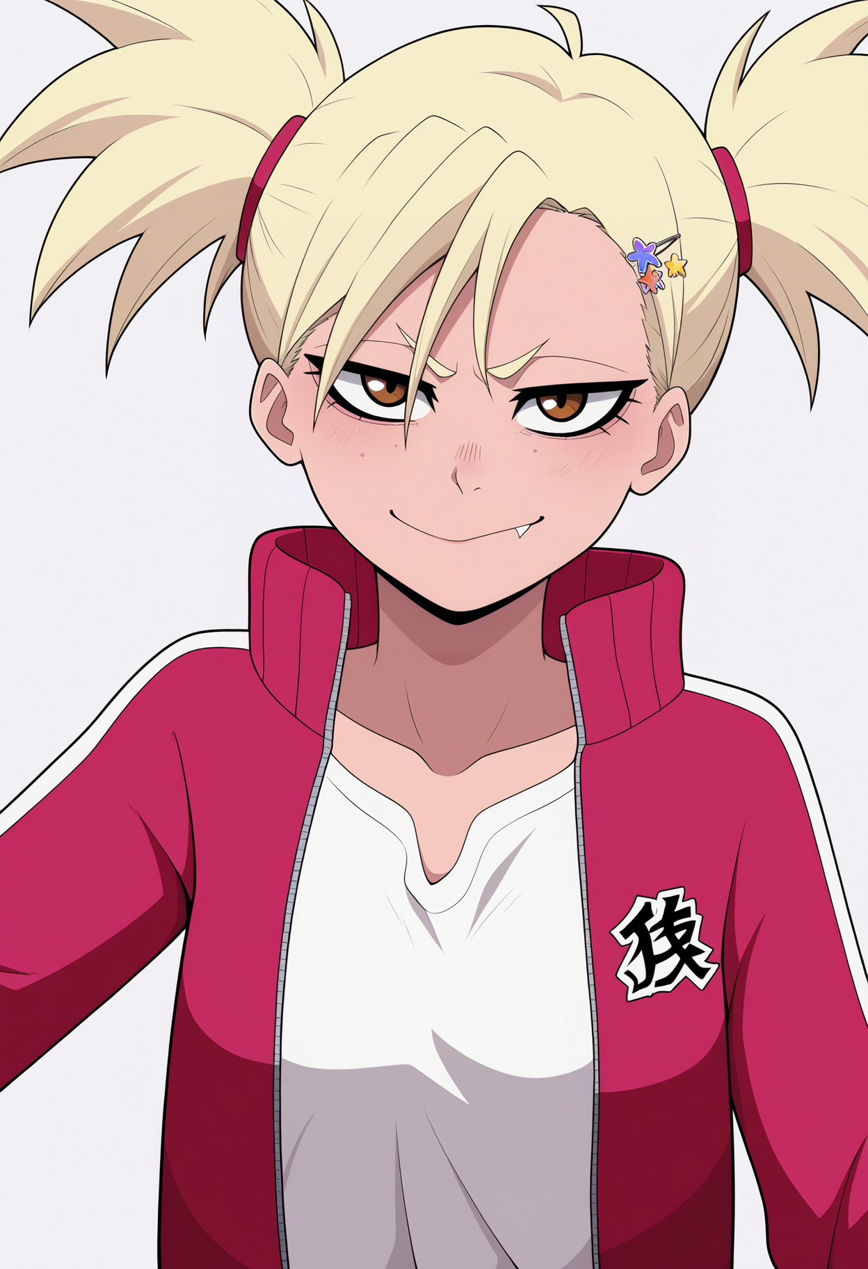 基本プロンプト:1girl, sarugaki hiyori, blonde hair, short twintails, brown eyes, freckles, hairclip, frown, fang