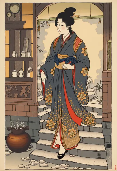 浮世絵の木版画や、伝統的なスタイルで活動する近代のアーティストでトレーニングされました。高レベルでは木版画を生成しますが、低レベルではマンガやアニメの生成に洗練された雰囲気を加えるのに使用できます。トリガーは必要ありませんが、すべてのキャプションに"janapz"が含まれていました。主に人物向けですが、風景も描画できます。