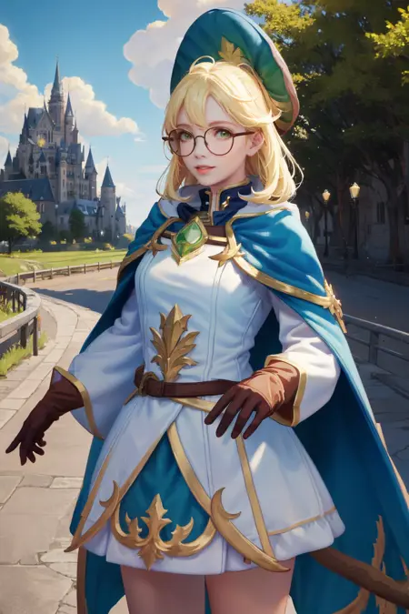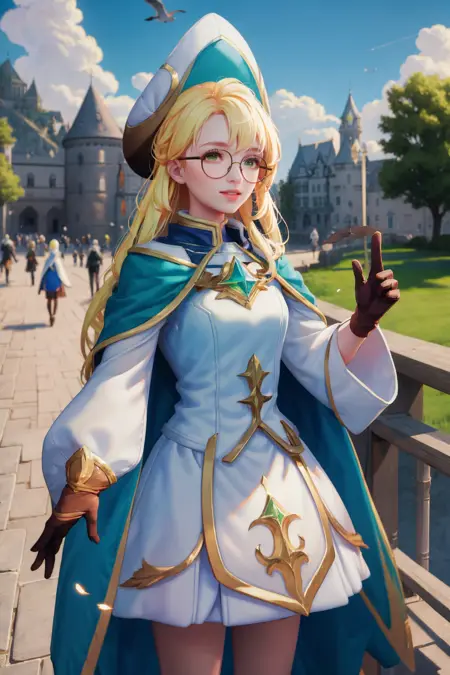 提示词:,1girl, solo, bangs, long hair, yellow hair, parted lips, green eyes, gloves, cloak, glasses, (purple|yellow:0.5) hat, (gulls), sky, clouds, castles, trees, look at the viewer, smile, the village, the road, the light harmonize