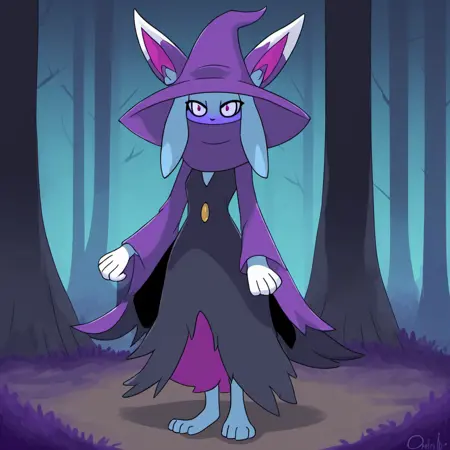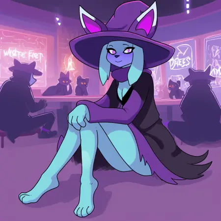 辅助标签: palworld, 蓝色毛发, 紫色衣物, 黑色衣物, 紫色帽子, 女巫帽, 紫色眼睛, 长袖
