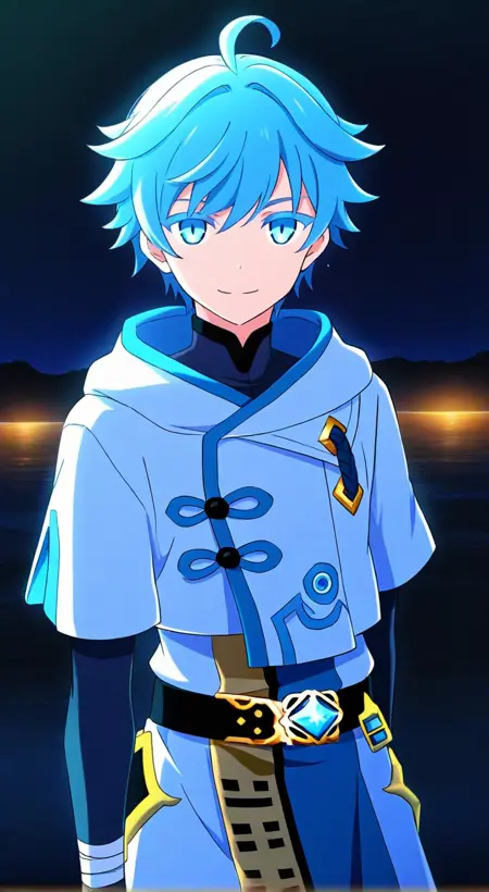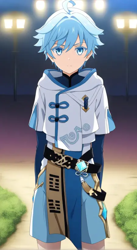 Trigger words: chongyun,blue hair,bangs,short hair,hair between eyes,ahoge,blue eyes