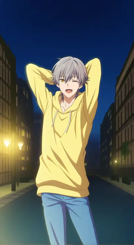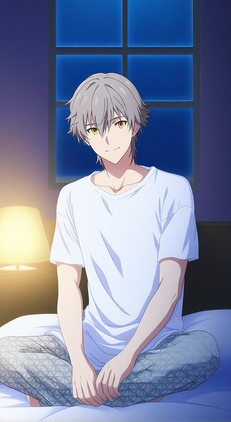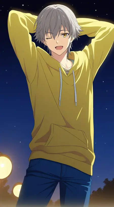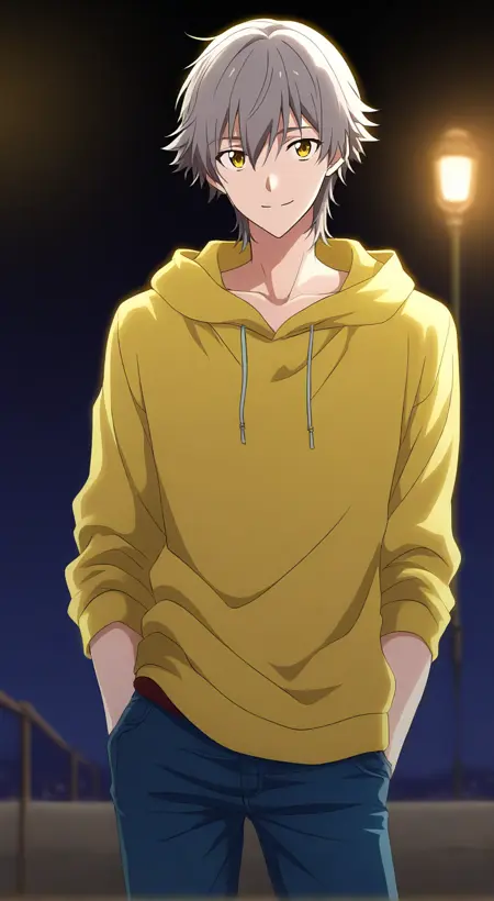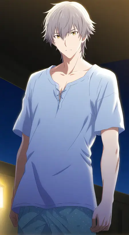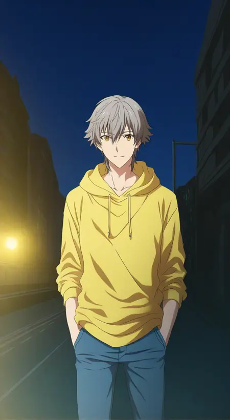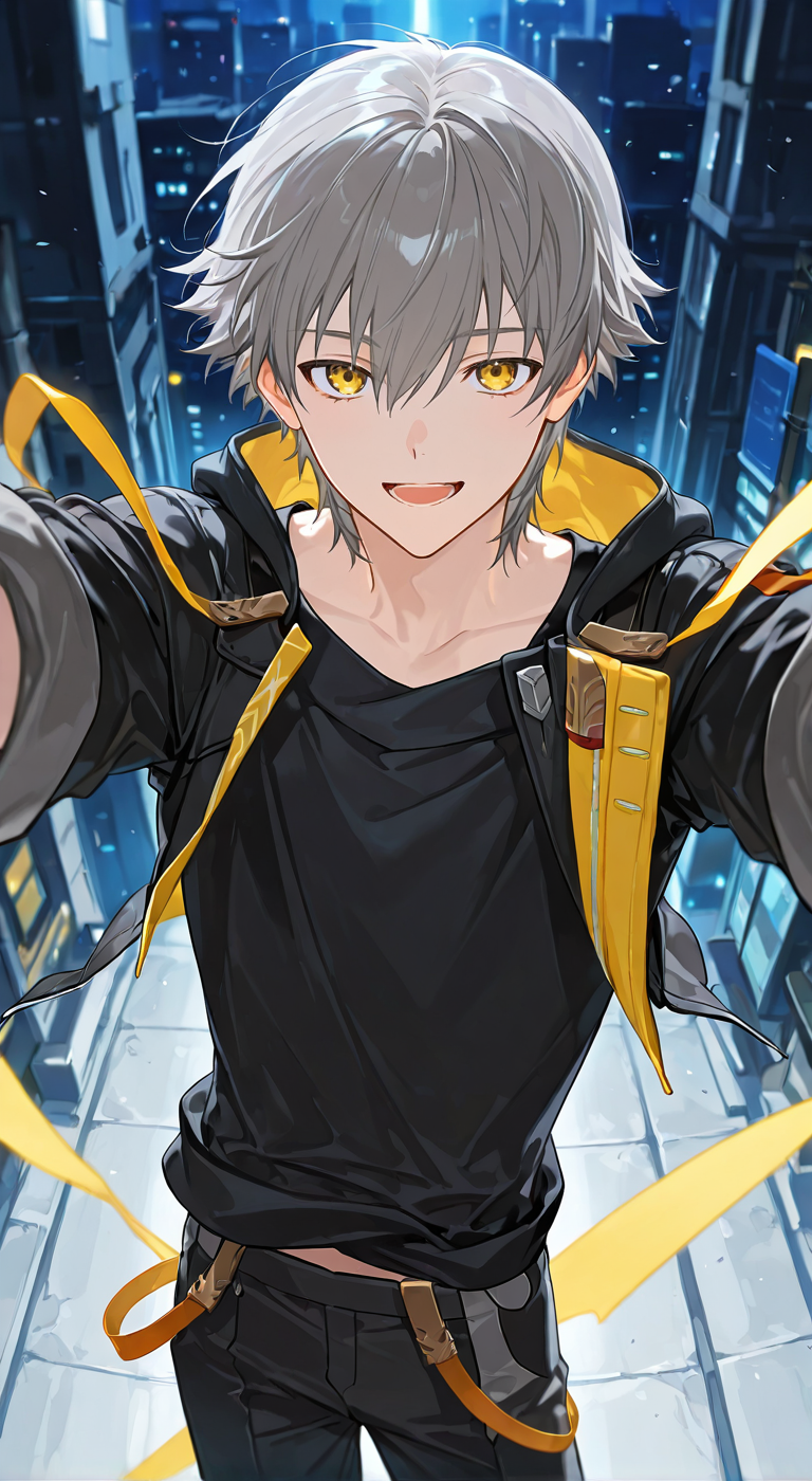 트리거 단어: caelus, 회색 머리, 단발, 눈 사이의 머리, 노란 눈