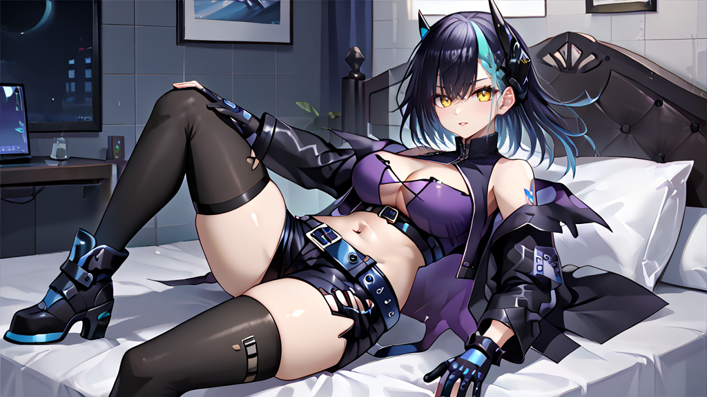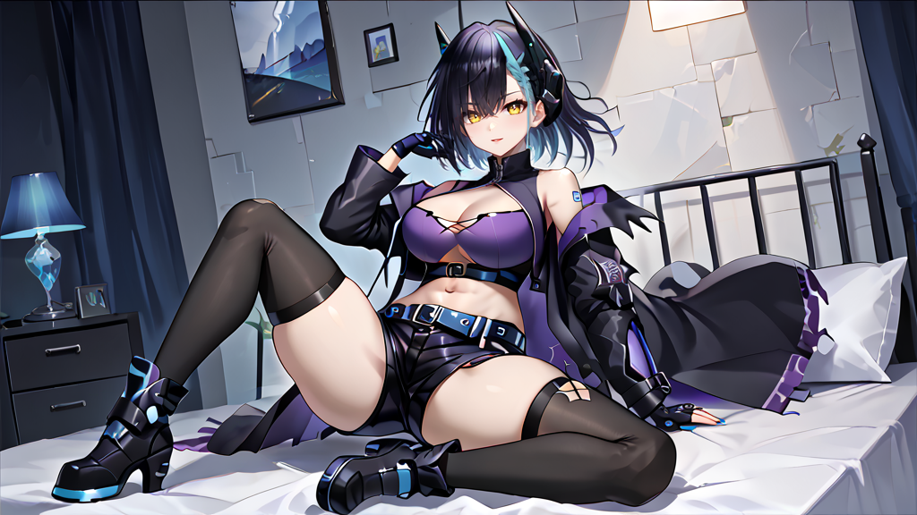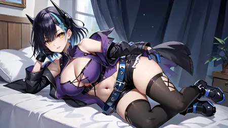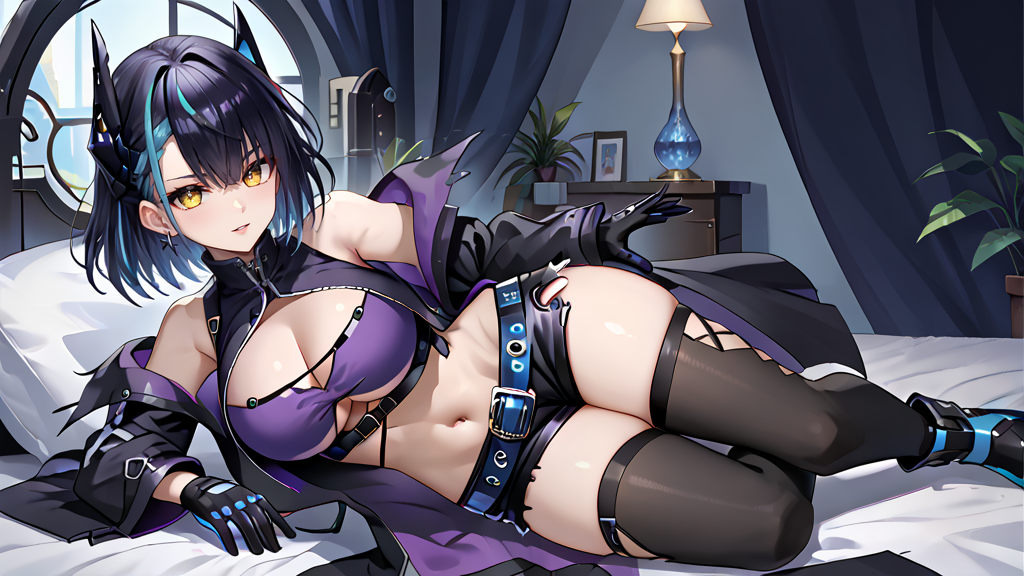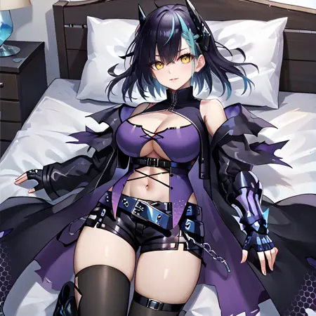 starry_hb, breasts, bangs, gloves, navel, cleavage, bare shoulders, full body, yellow eyes, black boots, open clothes, sleeveless, black gloves, midriff, belt, black thighhighs, streaked hair, coat, fur trim, short shorts, clothing cutout, underboob, black shorts, cleavage cutout, black coat, park, dynamic pose,