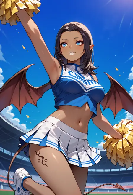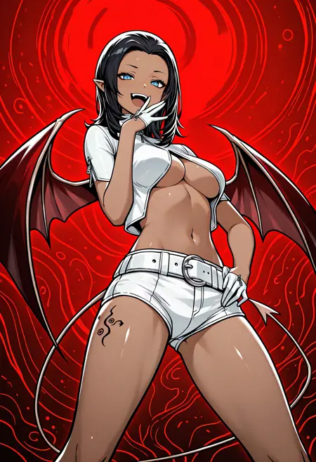 デフォルトの外見: limSMT、黒髪、中程度の髪、分け目のある髪、青い目、肌の黒い女性、とがった耳、白いショール(服)、ジッパー、短い袖、アンダーブレスト、悪魔の翼、腹部露出、白い手袋、ハーフグローブ、白いショートパンツ、短いショートパンツ、白いベルト、足のタトゥー、悪魔の尾