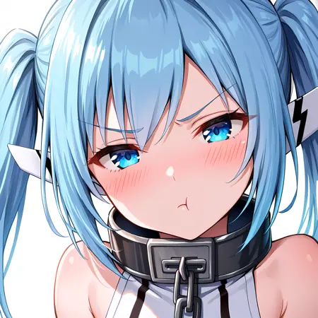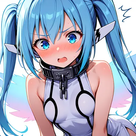 활성화 태그는 "nymph(soraoto), 1girl, solo, blue eyes, blue hair, small breasts, twintails, chain, collar,"이며, 의상 태그는 "thighhighs, wings, long hair, arms behind back, garter straps, bare shoulders, black thighhighs, dress, sleeveless"입니다.