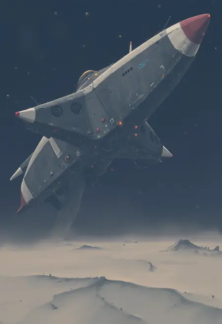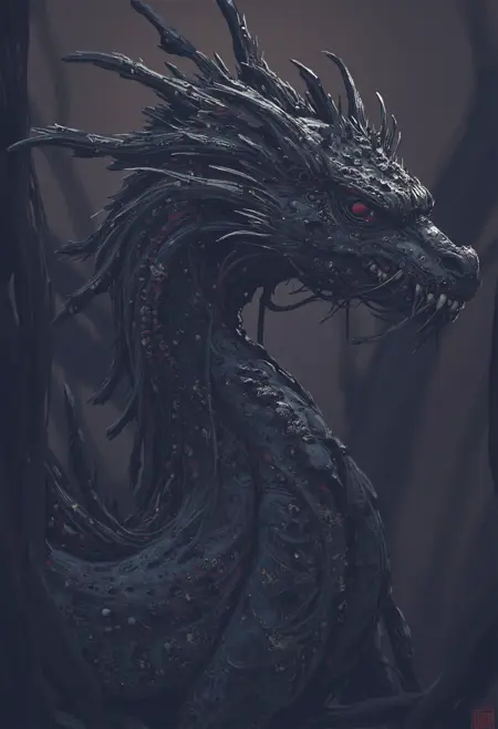 배경에는 안개 속에서 뾰족하게 솟아오른 몇 개의 비틀린 뼈처럼 생긴 기계들이 보인다. 그 기계들은 어두운 금속질의 몸체를 갖고 있으며, 희미한 안개 분위기와 대조된다. 이 기계들은 길고 뱀처럼 굽은 신체를 지니고 있으며, 여러 부위가 녹슬거나 부서진 채 다양한 붕괴 상태를 보인다. 중심에는 장면 위에 떠 있는 큰 검은 구체가 있으며, 희미하고 위협적인 빛을 내뿜고 있다. 전체 색조는 차분하고 차가운 색계로, 녹색, 회색, 검은색 음영이 주를 이루며 이미지의 기이하고 초월적인 분위기를 강화한다. 작품의 스타일은 매우 세밀하고 사실적이며, 질감과 분위기에 강조를 둔다.